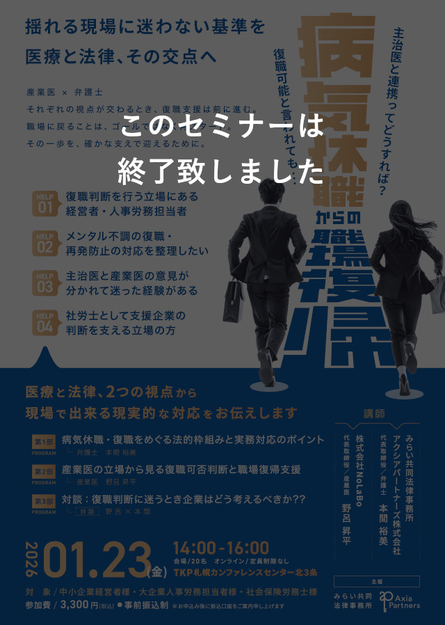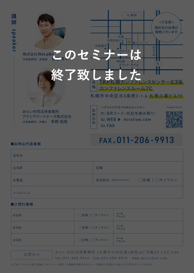申込方法:メール(info@mirailaw.com)またはFAX(011-206-9913)、お申し込みフォームよりお申し込み下さい。