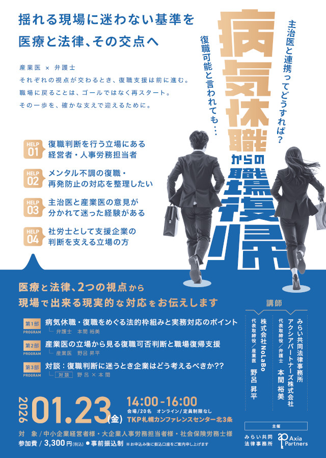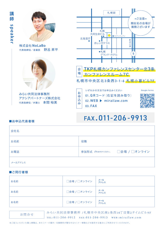 申込方法:メール【info@mirailaw.com】またはFAX【011-206-9913】、お申し込みフォーム【https://forms.gle/8NpjjrGn5hFsheqv5】よりお申し込み下さい。